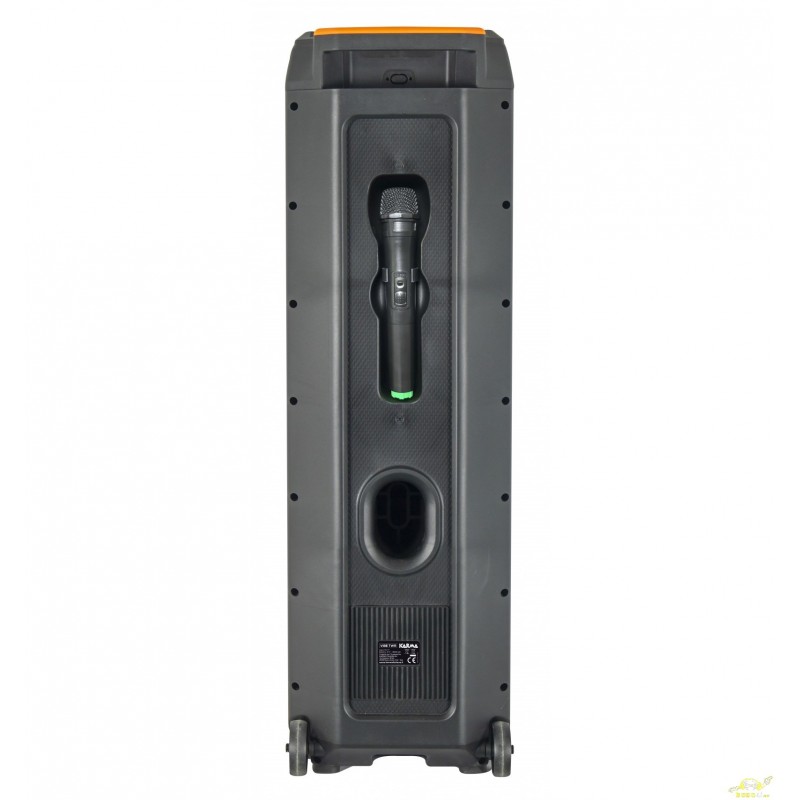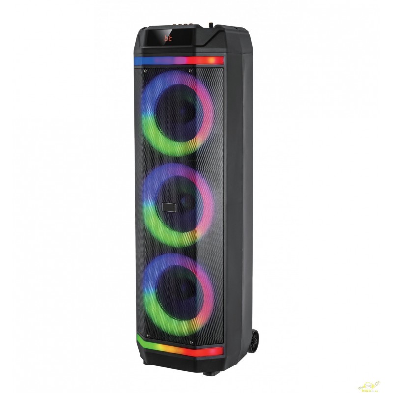 Altavoz portátil con tres woofers de 8" para un sonido excepcional. El panel frontal se ilumina con diversos efectos, pero los LED se pueden apagar. El panel de control frontal permite ajustar agudos, graves, eco, etc. Incorpora un reproductor MP3 mediante microSD y USB. El receptor Bluetooth se conecta a tu smartphone para reproducir tu propia música. El paquete incluye un mando a distancia por infrarrojos y un práctico micrófono inalámbrico.