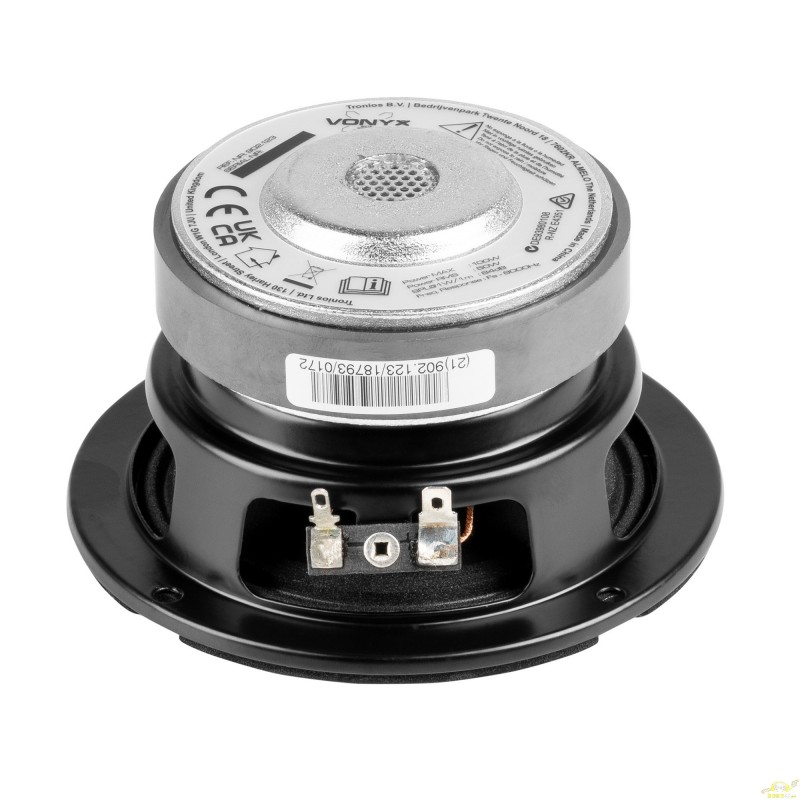 MarcaVonyxProduct colourBlackOutput power: Max100WOutput power: RMS50WDiameter woofer4"Voice coil1"Magnet typeFerriteMagnet weight10 ozFrequency response79 - 8.000HzSPL @ 1W/1m84dBImpedance8 OhmMounting diameter92mmMounting depth64mmDimensions (L x W x H)Ø113 x 64mmWeight (kg)