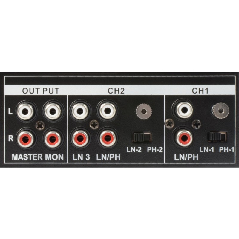 Con 2 entradas seleccionables linea/phono y salidas para master y monitor.