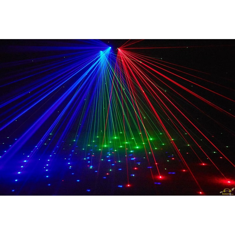 Láser rojo de 50 mW, Láser verde de 50 mW, Láser azul de 50 mW, 3 luces estroboscópicas de luz dorada de 10 W