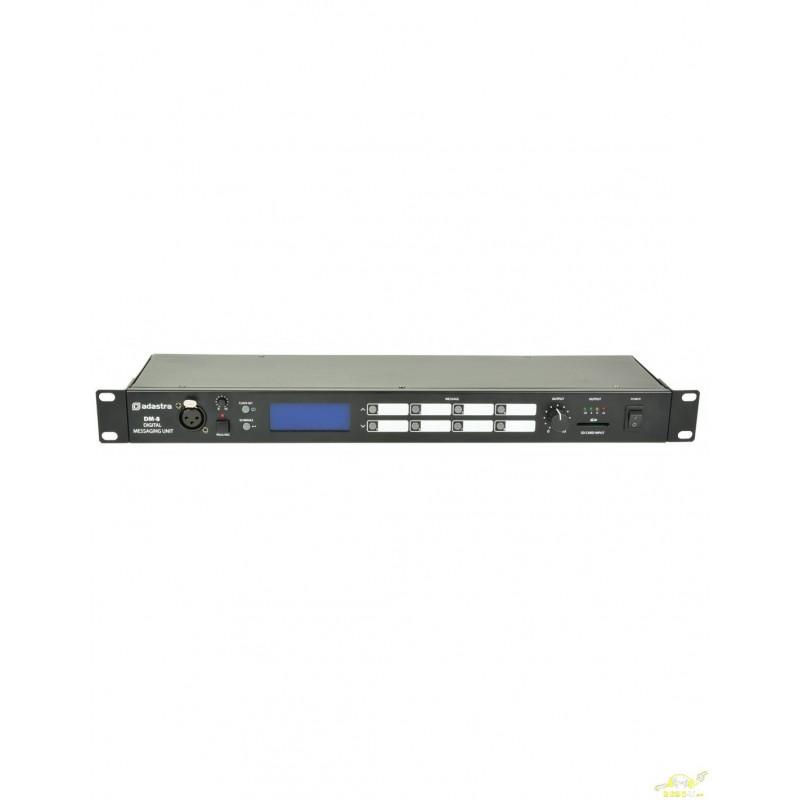 Unidad de mensajería digital de montaje en rack de 1U para reproducción de audio programada. Los archivos de audio se almacenan en una tarjeta SD extraíble y se pueden transferir insertándolos en una PC o grabados directamente en el DM-8. Los horarios también se almacenan en la tarjeta SD como un archivo separado, que se puede editar con un PC y almacenar para una copia de seguridad. Las tarjetas SD separadas se pueden guardar con diferentes mensajes de audio y horarios y se pueden intercambiar por diferentes rutinas. Se puede usar una entrada de micrófono / línea para grabar o para anuncios en vivo que pueden anular la reproducción de SD. Se proporciona una entrada de línea BGM para la reproducción de música de fondo con su propio control de nivel y se silencia cuando se reproducen mensajes o durante la búsqueda. Se pueden programar hasta 99 horarios para reproducir un archivo de audio particular desde la tarjeta SD, establecido por 24 horas y día (s) de la semana.