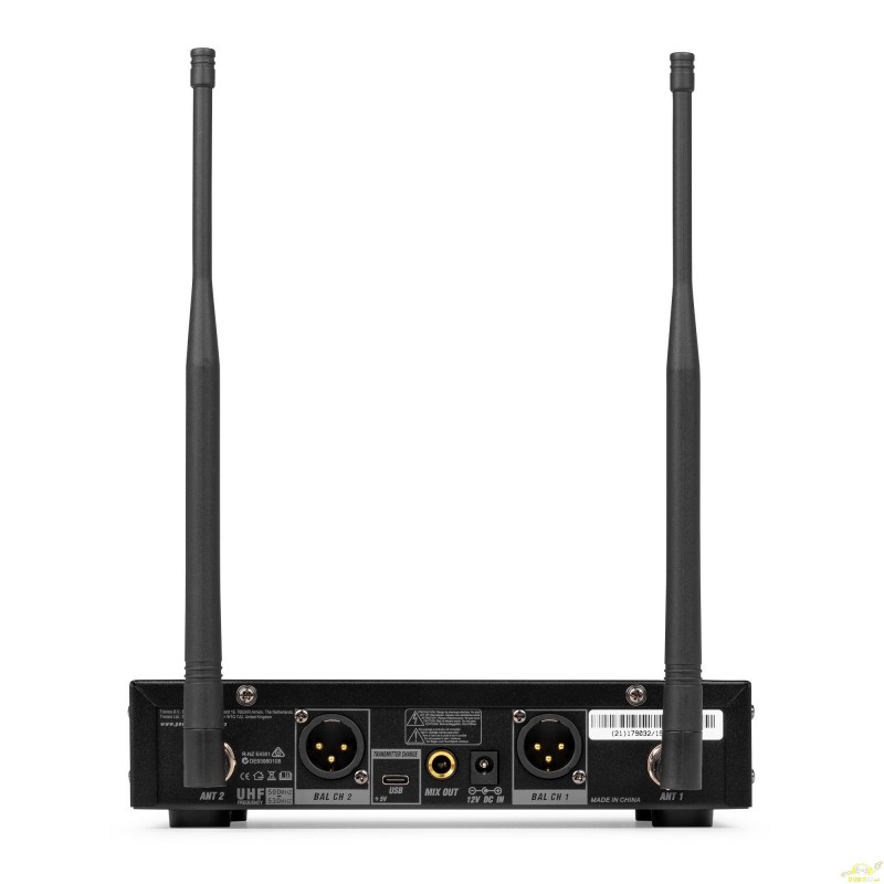 Este conjunto viene con un receptor UHF de 2 canales, 2 micrófonos de mano con batería recargable de iones de litio, dos antenas BNC extraíbles, dos cables extensores para el montaje frontal de las antenas, un adaptador de corriente y un caja de aluminio. También se incluyen cables USB para cargar los micrófonos inalámbricos.